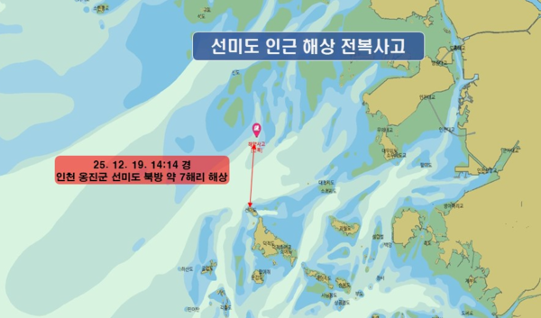 19일 인천해경에 따르면 이날 오후 2시 14분께 인천 옹진군 선미도 북방 약 7해리 인근 해상에서 전복된 어선(7.93톤, 승선원 5명)이 있다는 신고가 접수됐다.