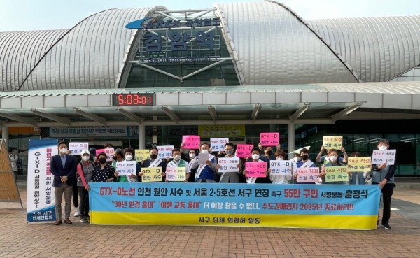 인천 서구 지역 주민단체 등으로 구성된 인천 서구 단체연합회(이하 연합회)는 지난달 31일 오후 서구 검암역 앞에서 GTX-D노선 인천시 원안사수 및 서울 2·5호선 서구연장을 촉구하하는 20만 서구민 서명운동 출정식을 개최했다.