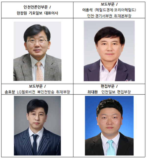부문별 수상자는 인천언론인에 한창원 기호일보 대표이사, 보도부문에는 이홍석 헤럴드경제 인천취재본부장, 송효창 LG헬로비전 북인천방송 취재기자, 편집부문에는 최대환 인천일보 기자를 포함해 4명을 선정했다.