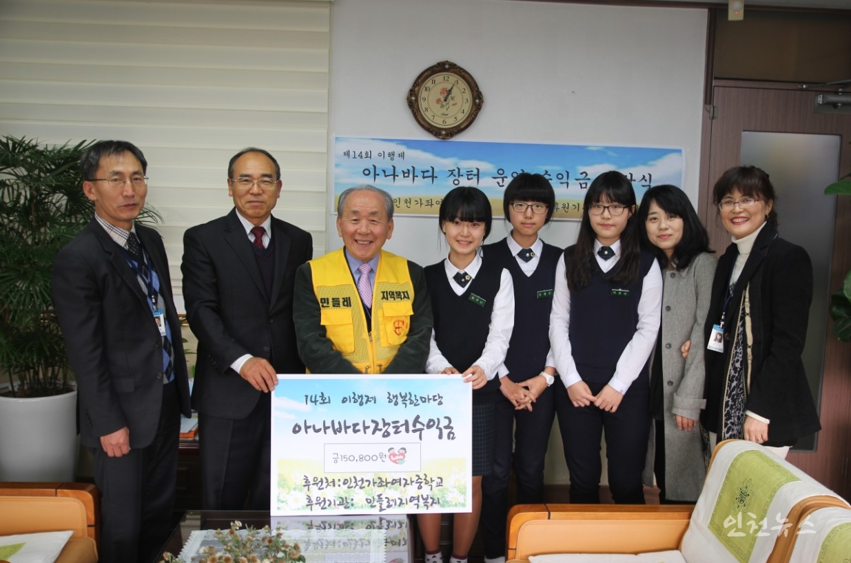 인천가좌여자중학교(교장 박희정)는 1일, 인천교구 사회복지회 민들레 지역복지(대표 이상희 신부)에 지난 ‘제14회 이행제 행복한마당’에서 열렸던 아나바다 장터의 수익금을 전액 기부하는 전달식을 하였다.